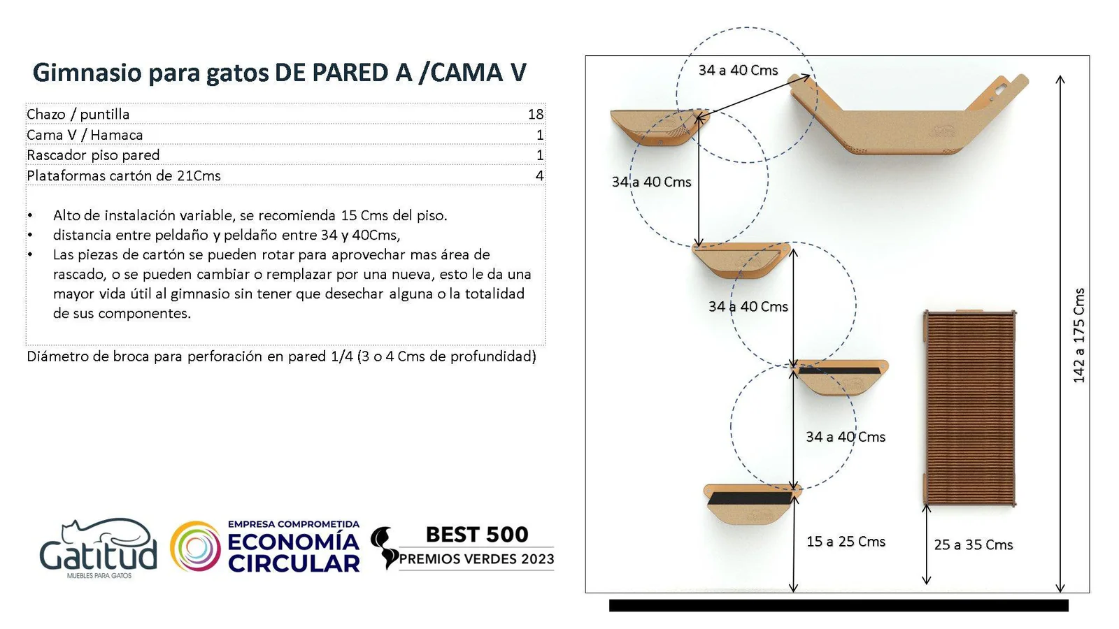 Gimnasio rascador para gatos en madera mdf y rascador vertical en cartón corrugado, Fijación a pared, 4 peldaños de largo 18Cms profundidad 22 Cms,, 1 torre de rascador de alto 70 Cms y 1 cama V superior de largo 65 Cms y profundidad 29Cms.